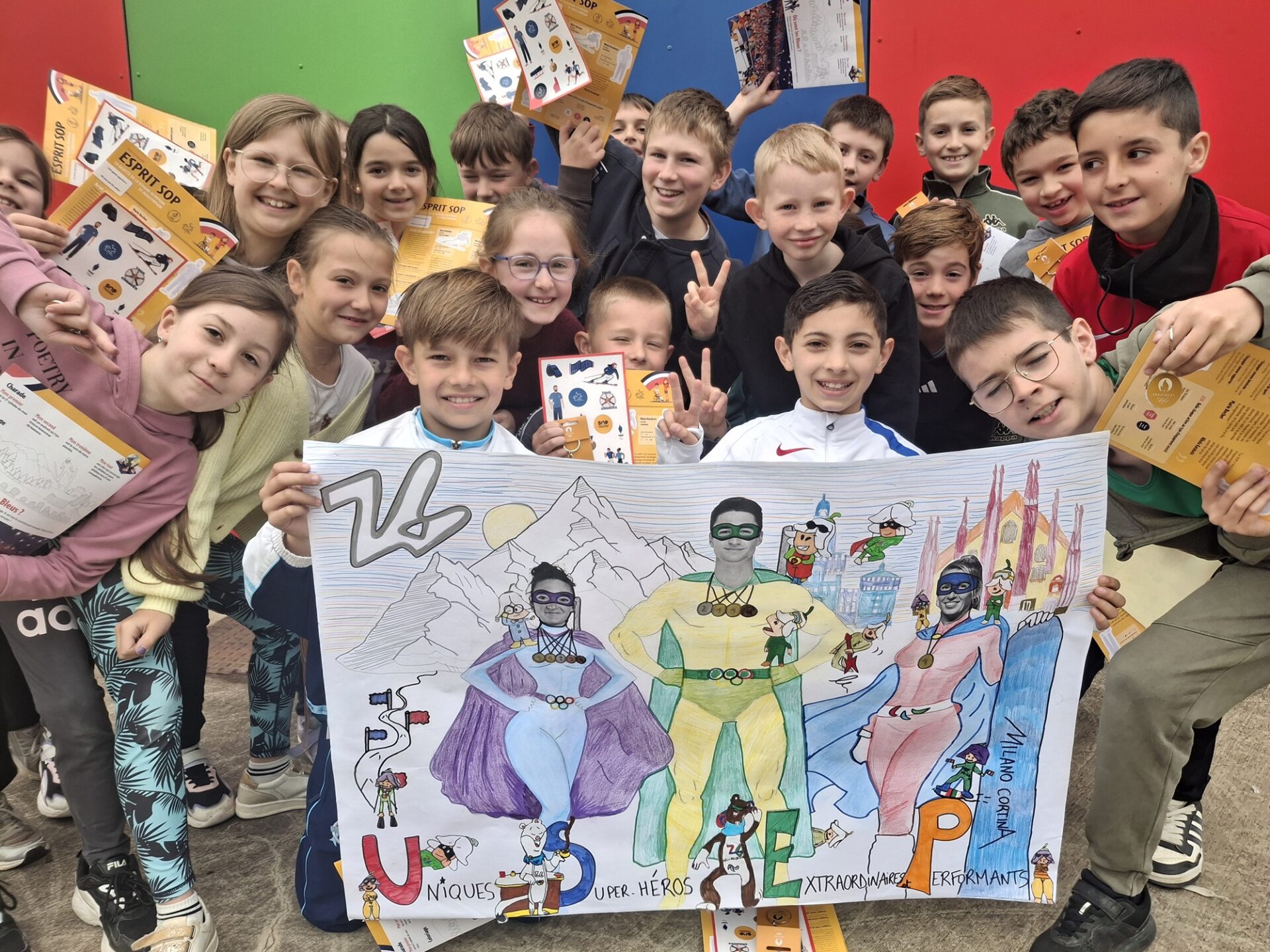 Uniques Super-héros Extraordinaires Performants en Mayenne. Dans le cadre de la SOP, les CM1 de l’école Jean-Monnet d’Évron ont travaillé sur le handicap, avec comme déclinaisons sportives un parcours solidaire, une course à l’aveugle et une découverte de la boccia à travers le parcours de la championne paralympique Amélie Aubert. Ils ont aussi participé au concours départemental de productions culturelles portant, au choix, sur les « disciplines » et « athlètes » des JOP, sur « l’Italie » pays hôte des Jeux de Milan-Cortina, et enfin sur « l’engagement », thème de la SOP brillamment illustré par les CE2-CM1 du Genest-Saint-Isle.